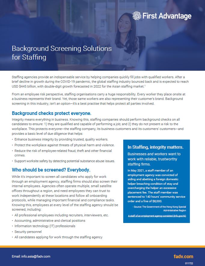 Staffing agencies provide an indispensable service by helping companies quickly fill jobs with qualified workers. From an employee risk perspective, staffing organisations carry a huge responsibility. Every worker they place onsite at a business represents their brand. Yet, those same workers are also representing their customer’s brand. Background screening in this industry, isn’t an option—it’s a best practise that helps protect all parties involved.